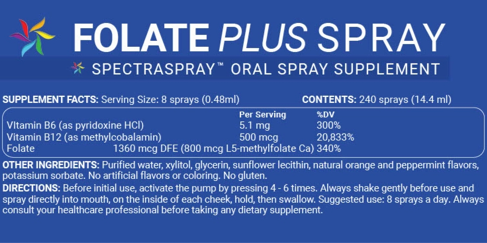Diabetic & Bariatric patient friendly. TSA compliant. Sugar free, gluten free, dairy free. No binders, fillers or allergens. Non-GMO. Manufactured in USA. 30 servings | 240 sprays | 8 sprays each.