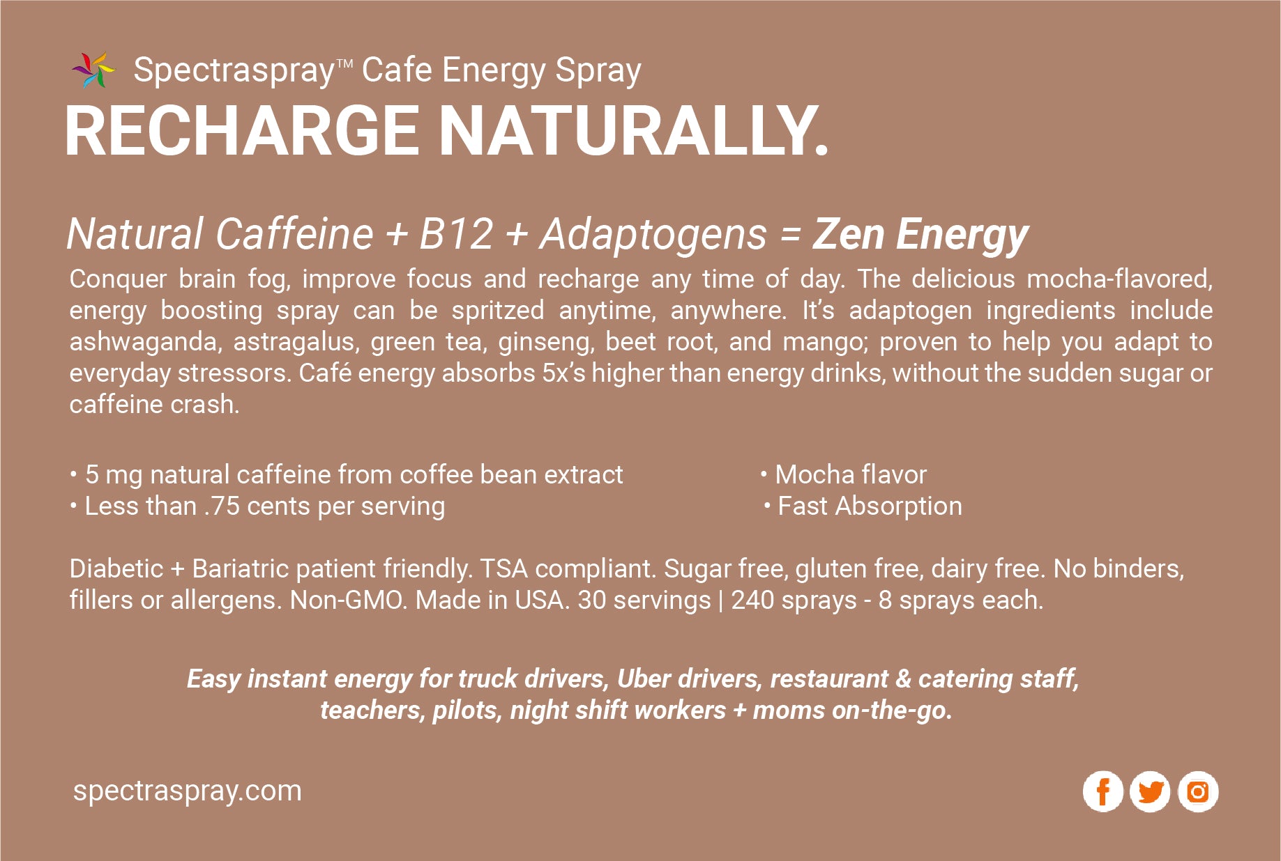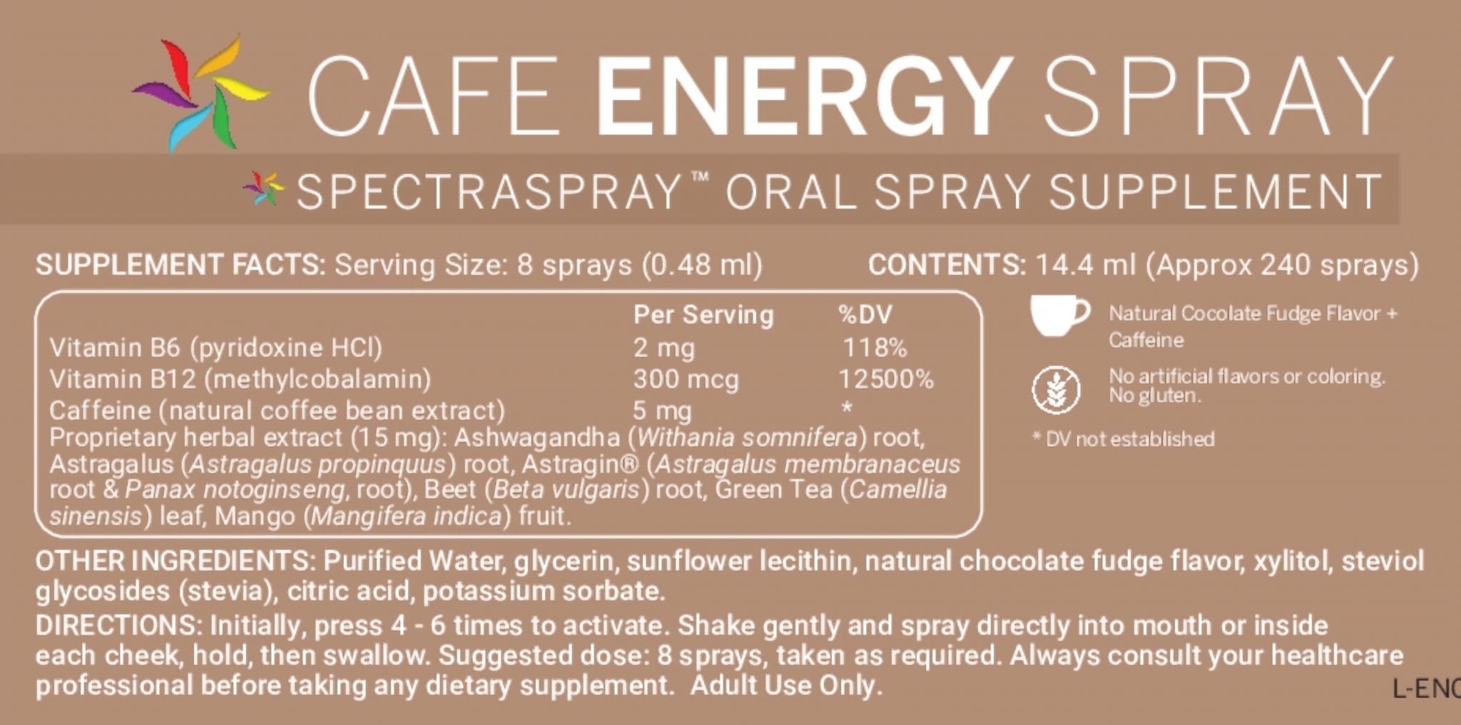 SpectraSpray™ Cafe Energy Spray provides the instant boost of natural energy just when you need it. Conquer brain fog, improve focus, and RECHARGE NATURALLY any time of day. Its delicious mocha-flavor has chocolate tones to satisfy your cravings.