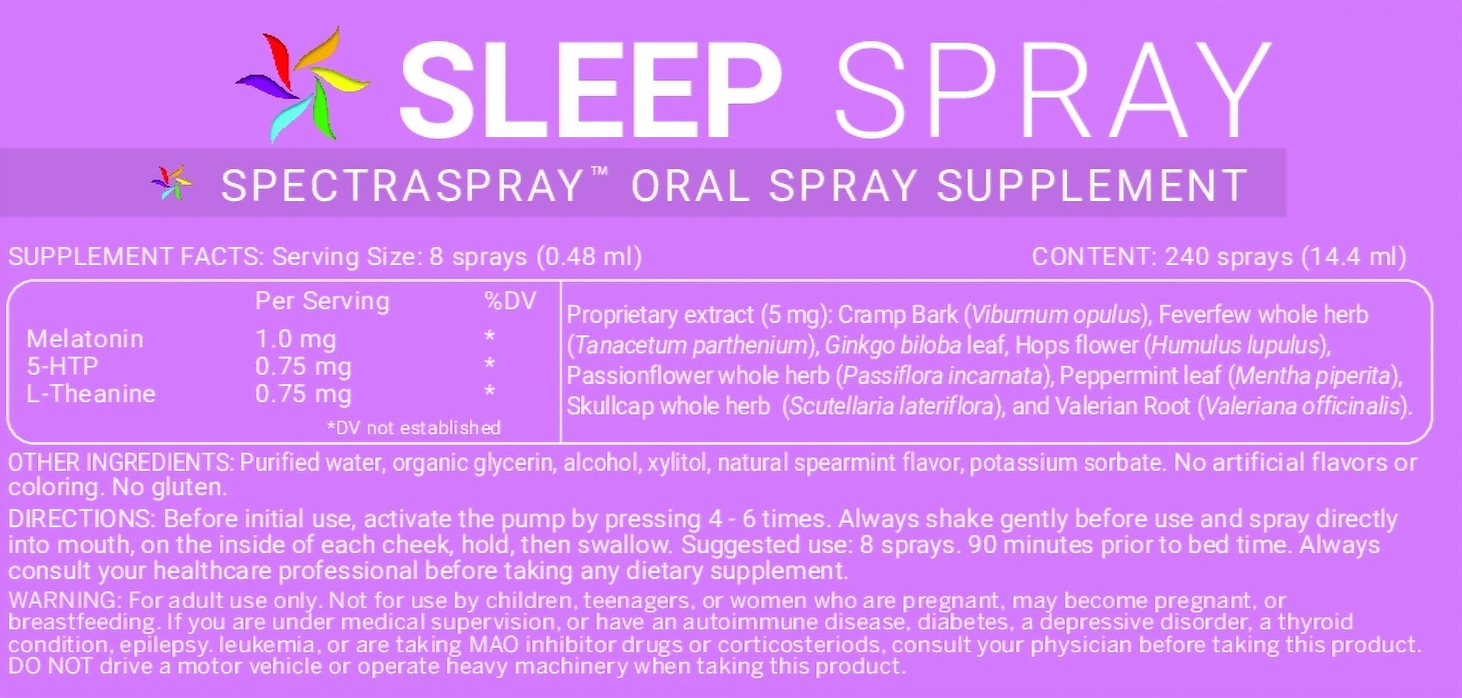 Sleep Spray: Melatonin, 5 HTP (5-hydroxy tryptophan) , L-Theanine; proprietary extract-Valerian Root, Cramp Bark, Feverfew, Ginkgo Biloba, Passionflower & Skullcap.
