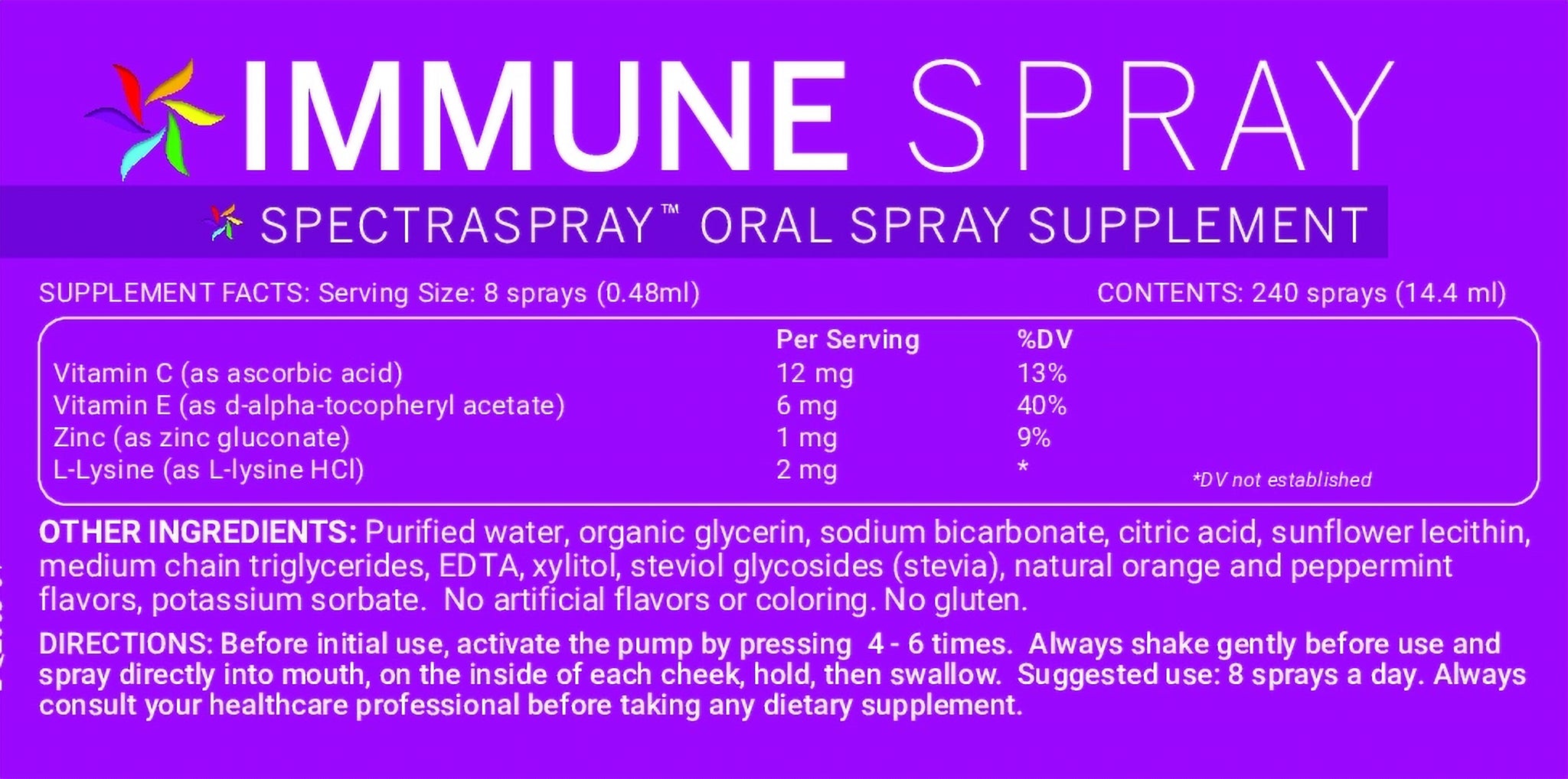 Immune Spray : Sodium L-ascorbate (vitamin C / buffered); vitamin E-acetate; zinc gluconate; L-lysine HCl