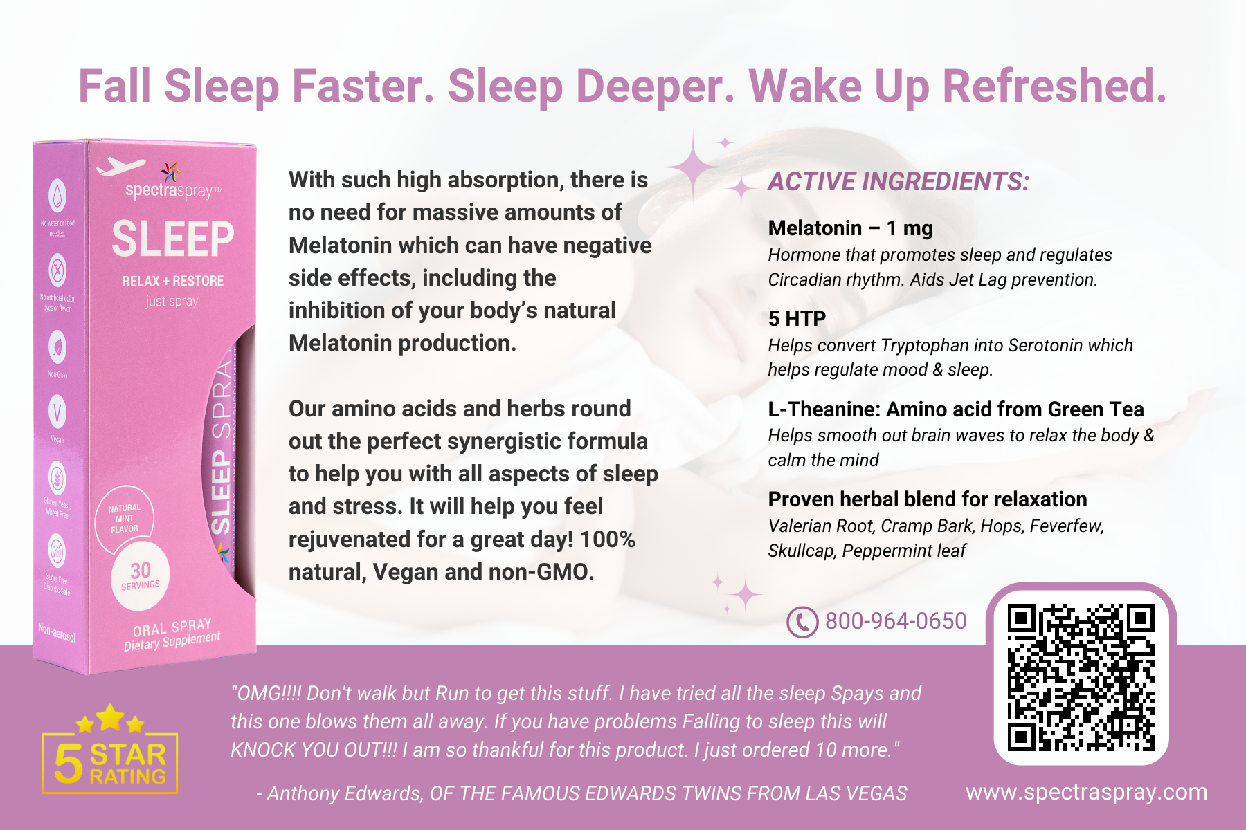 SpectraSpray™ Sleep Spray is an easy-to-use 'DRUG-FREE',  vegan oral spray supplement for natural support to help your mind and body relax into a healthy deep sleep without a drowsy feeling the next day. Relaxing mint flavor. Proven herbal formulation to support relaxation and stress reduction.